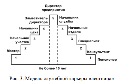 Модель карьеры «лестница» предусматривает, что каждая ступенька служебной карьеры представляет собой определенную должность, которую работник занимает фиксированное время, например, не более 5 лет. Такого срока достаточно для того, чтобы войти в новую должность и проработать с полной отдачей. С ростом квалификации, творческого потенциала и производственного опыта руководитель или специалист поднимается по служебной лестнице. Каждую новую должность работник занимает после повышения квалификации