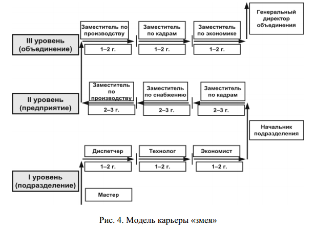 Модель карьеры «змея» пригодна для руководителя и специалиста. Она предусматривает горизонтальное перемещение работника с одной должности на другую с занятием каждой непродолжительное время (1–2 года). Например, мастер после обучения в школе менеджеров работает последовательно диспетчером, технологом и экономистом, а затем назначается на должность начальника цеха. Это дает линейному руководителю более глубоко изучить конкретные функции управления, которые ему пригодятся на вышестоящей должности. Прежде чем стать директором предприятия, руководитель в течение 6–9 лет работает заместителем директора по кадрам, коммерции и экономике и всесторонне изучает важные участки деятельности. Главное преимущество данной модели заключается в возможности удовлетворения потребности человека в познании интересующих его функций управления. Это предполагает постоянное перемещение кадров в аппарате управления, наличие четкой системы назначения и перемещения и детальное изучение социально–психологического климата в коллективе.