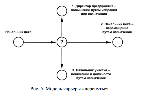 Модель карьеры «перепутье» предполагает по истечении определенного фиксированного или переменного срока работы прохождение руководителем или специалистом комплексной оценки (аттестации), по результатам которой принимается решение о повышении, перемещении или понижении в должности. Эта карьера может быть рекомендована для совместных предприятий и зарубежных фирм, применяющих трудовой договор в форме контракта. По своей философии это американская модель карьеры, ориентированная на индивидуализм человека.