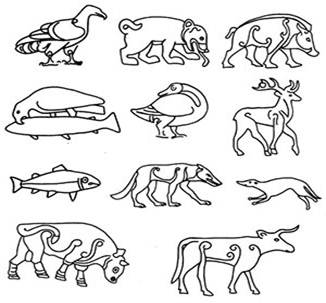 Часто встречаются изображение птиц. Они символизируют посланников, свободу Духа, освобождению от земных связей и общению с небесными силами. Птицы помогают людям в их духовных и земных путешествиях. Так ворон – символ предзнаменований, утка – это некий мост который соединяет земные воды с океаном небесных сил. Голуби – птицы духовной жизни, любви и гармонии, цапля – птица бдительности. Так же можно встретить изображение дельфинов и собак, змей и зайцев и т.д.