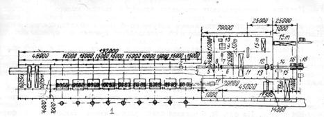 1- нагревательные колодцы; 2 — тележка-опрокидыватель; 3 — весы для слитков; 4 — приемный рольганг; 5— передний рабочий рольганг; 6 — задний рабочий рольганг; 7 — горизонтальные валки слябинга, 8 — вертикальные валки слябинга; 9 — мотор для горизонтальных валков; 10 — мотор для вертикальных валков; 11 — подводящий рольганг к ножницам; 12 — ножницы для слябов и упор; 13 — конвейер для уборки обрезков; 14 — отводящий рольганг от ножниц; 15 — весы для слябов; 16 — карманы для слябов и сталкиватели; 17 — яма для уборки шлака от колодцев
