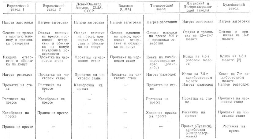 Из табл. 8 видно, что производство бандажей на заводах европейских фирм является менее совершенным, чем производство на заводах англо-американских фирм (Деви — Юнайтед, Болдвин, табл. 8) и заводах СССР, не считая реконструированных установок. Последние три схемы относятся к бандажепрокатным установкам СССР (Таганрогский, Луганский, Днепродзержинск и Кулебакский заводы) [18]. Эти установки устарели и мало производительны. Наличие на Таганрогском заводе пресса, а на Кулебакском двух прокатных станов делает их несколько более совершенными.