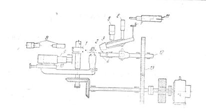 Фиг. 45. Схема чернового бандажепрокатного стана фирмы Деви: 1—главный валок; 2 — нажимной ролик; 3 — верхний эджер; 4 – нижний эджер; 5 – нажимной цилиндр; 6 – цилиндр для подъема; 7 – механизм для изменения угла наклона оси верхнего эджера; 8 – цилиндры боковых роликов; 9 – цилиндр для нажимного ролика (рабочий); 10 – цилиндр обратного хода нажимного ролика; 11 – цилиндр боковых роликов эджерной каретки; 12 – квадратный вал; 13 – привод квадратного вала нижнего эджера; 14 - мотор
