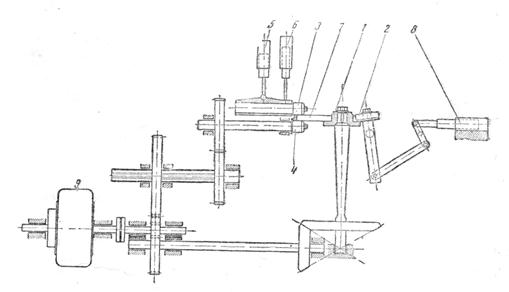 Фиг.46. Схема бандажного стана фирмы Вагнер: 1 – главный валок; 2 – нажимной ролик; 3 – верхний эджер; 4 – нижний эджер; 5 – нажимной цилиндр; 6 – цилиндр для подъема; 7- бандаж; 8 – цилиндр нажимного ролики; 9 – мотор
