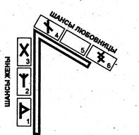 Руны в поз. 4, 5, 6 — шансы любовницы мужа. Это руны Наутиз (10), Вирд (пустая) и Ингуз (22). Наутиз сообщает, что отношения мужа и его любовницы заторможены. В них нет духовности, только секс. Вторая руна, Вирд (пустая), и того хуже. Будущее весьма туманно и непредсказуемо. А Ингуз говорит о завершении процесса, в данном случае — любовной связи. Появление этой руны в раскладе означает выход из состояния «куколки». Идет высвобождение, избавление от надоевшего, старого.