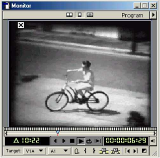 Для просмотра смонтированного фильма достаточно нажать кнопку Play в окне Monitor. При предварительном просмотре в окне Monitor переходы, фильтры и другие эффекты игнорируются, о чем информирует значок X, расположенный в углу окна программы.