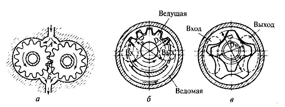 Рис. 6.1. Масляные насосы с внешним (а) и внутренним (эвольвентным — б, эпициклоидальным — в) зацеплением