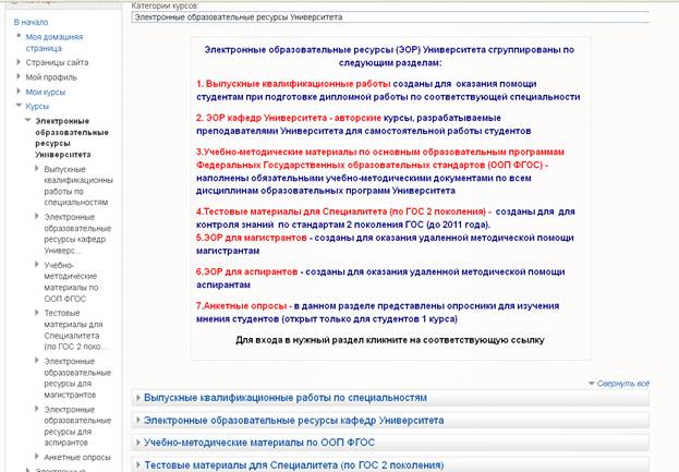Поскольку вся самостоятельная работа студента происходит в рамках Курса-дисциплины, вкратце дадим основные понятия и опишем интерфейс курса. В рамках данной Системы курс представляет собой не только средство организации процесса обучения в традиционном его понимании. Курс может являться просто средой общения круга заинтересованных людей в рамках одной тематики, в курсе можно работать над дипломной работой, в курсе можно только анкетироваться. Все курсы в рамках системы распределяются по категориям. Названия категорий являются ссылками, при переходе по которым можно увидеть список курсов только этой категории с расширенной информацией. В основном все учебные курсы находятся в категории Электронные образовательные ресурсы Университета, кликнув на название данной категории появится окно,