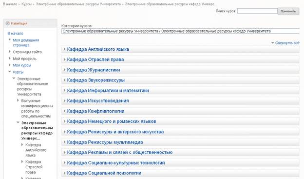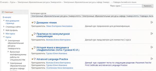 На данной странице Вы выбираете кафедру, которая преподает нужную Вам дисциплину. Далее, чтобы найти курс, принадлежащий определенной кафедре необходимо кликнуть на название кафедры, например в категории "Кафедра Английского языка" будут видны все курсы данной кафедры, которые на данный момент являются доступными для студентов.