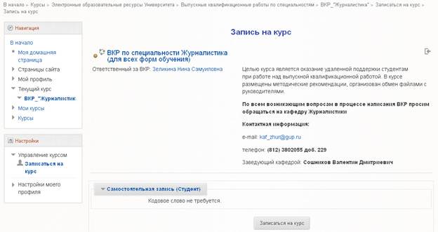 Как видно из рисунка за курсом как правило закреплен преподаватель, который его редактирует и работает в нем со студентами дистанционно. Для входа в курс-дисциплину необходимо кликнуть на его название. После этого загрузится страница записи на курс. Кликните на кнопку Записаться на курс.