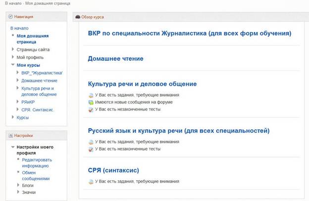 Моя домашняя страница – это личная страница пользователя, доступная только ему. Кликнув на ссылку Моя домашняя страница студент видит следующую страницу(рисунок).
