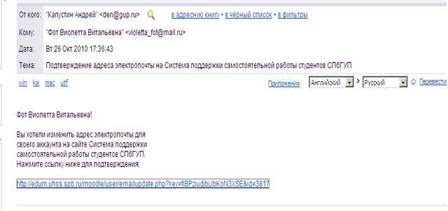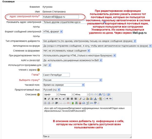 Как видно из рисунка, основная информация о пользователе уже внесена в систему автоматически. Ее можно оставить без изменений. Обратить внимание надо на адрес электронной почты. В системе указан корпоративный адрес электронной почты, но пользователь может изменить его и указать тот, которым он пользуется постоянно, поскольку именно на него будут приходить все сообщения и уведомления системы, как показано на рисунке.