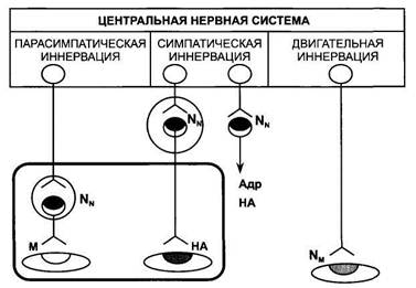 Адр - адреналин; НА - норадреналин; М - М-холинорецепторы; NN - N-холинорецеп-