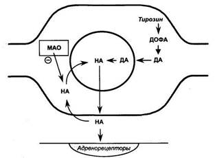 НА - норадреналин; ДА - дофамин; МАО - моноаминоксидаза.