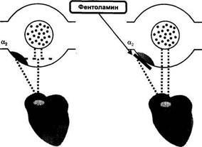 Рис. 24. Влияние фентоламина на выделение норадреналина в сердце. Фентоламин блокирует пресинаптические а2-адренорецепторы и увеличивает высвобождение норадреналина, который стимулирует β 1-адренорецепторы клеток синоатриального узла и повышает частоту сокращений сердца.