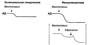 Рис. 25. Сравнение гипотензивного действия фентоламина при эссенциальной гипертензии и феохромоцитоме.