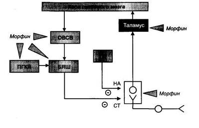 Морфин нарушает передачу болевых импульсов не только в спинном мозге, но и в высших отделах ЦНС, в частности, в неспецифических ядрах таламуса.