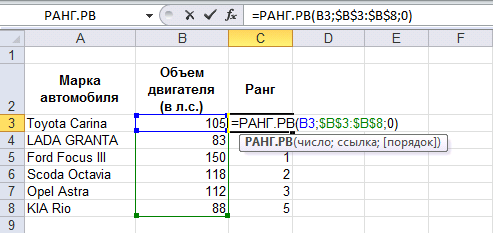 =РАНГ.РВ(B3;$B$3:$B$8;1)