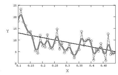 Различные виды построения аппроксимирующей зависимости f(x) иллюстрирует рис. 1. На нем исходные данные обозначены кружками, интерполяция отрезками прямых линий - пунктиром, линейная регрессия - наклонной прямой линией, а фильтрация - жирной гладкой кривой.