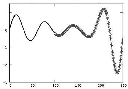 Таким образом «предсказывающаяся функция» predict(v,m,n) использует существующие данные, чтобы предсказать новые данные, которые находящиеся за пределами задания. Она использует линейный алгоритм предсказания, который является достаточным, когда функции гладкие или знакопеременные, хотя не обязательно периодические.