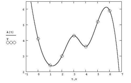 Для осуществления сплайновой аппроксимации MathCAD предлагает четыре встроенные функции. Три из них служат для получения векторов вторых производных сплайн-функций при различном виде интерполяции:
