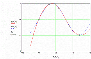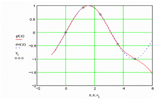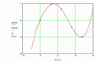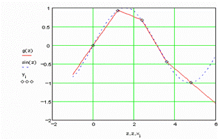 Решим задачу об интерполяции синуса с помощью сплайнов через функцией interp(VS,x,y,z). Переменные x и y задают координаты узловых точек, z является аргументом функции, VS определяет тип граничных условий на концах интервала.