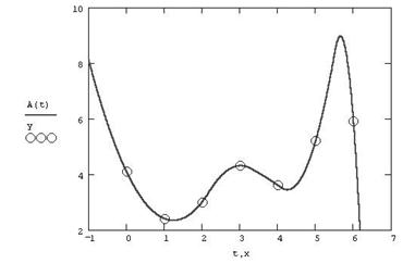 bspline (vx, vy, u, n) Возвращает вектор, содержащий коэффициенты В- сплайна степени n для данных, которые находяться в векторах vx и vy (с учетом значений узлов, которые заданы в u). Возвращаемый вектор становится первым аргументом функции interp.