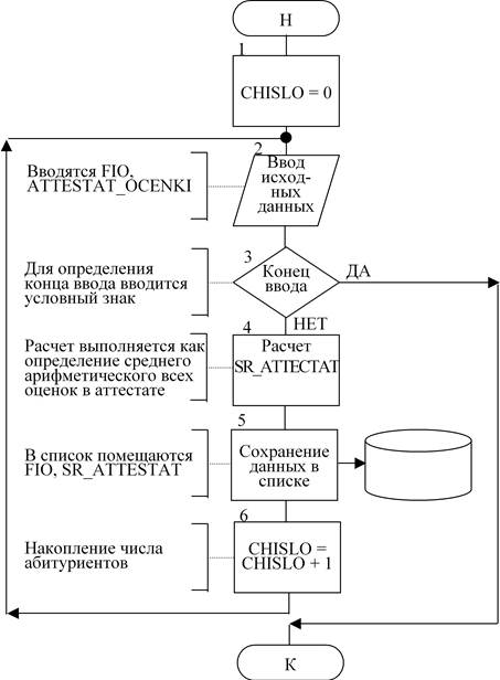 В блоке 1 переменной CHISLO присваивается начальное нулевое значение – выполняется ее подготовка к накоплению числа абитуриентов, которое осуществляется в цикле в блоке 6. В блоке 2 вводятся исходные данные по одному абитуриенту – его фамилия, имя, отчество, список оценок по аттестату. Данные заносятся в соответствующие переменные (см. комментарий к блоку). Для прерывания цикла задаются специальным знаком, ввод которого свидетельствует об окончании ввода списка абитуриентов. Этот анализ выполняется в блоке 3. Если достигнут конец списка абитуриентов (выход ДА), алгоритм прекращает свою работу. Если конец цикла не достигнут (выход НЕТ), рассчитывается среднее арифметическое значение оценок в аттестате (блок 4). Затем фамилия, имя, отчество и средний балл по аттестату запоминаются на диске (блок 5).