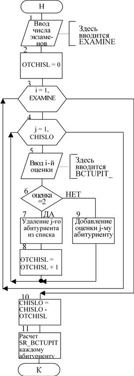 В блоке 1 вводится число вступительных экзаменов. В блоке 2 формируется начальное (равное нулю) значение числа отчисленных абитуриентов: эта переменная нужна для определения реального числа абитуриентов, сдавших экзамены и допущенных к зачислению. В блоке 3 организуется циклический процесс, позволяющий по каждому вступительному экзамену выполнить ввод соответствующих оценок по каждому абитуриенту. Обращение ко всем абитуриентам организуется с помощью блока 4. Если введенная оценка равна 2, абитуриент исключается из списка, размещенного на диске (блок 7). В противном случае оценка добавляется к списку оценок абитуриента (блок 9). Внутри цикла формируется также число отчисленных абитуриентов (блок 8). Таким образом, данный алгоритм является примером вложенной циклической структуры, когда один циклический процесс вложен в другой. По окончании цикла определяется число оставшихся абитуриентов (блок 10) и рассчитывается средний балл за вступительные экзамены по каждому абитуриенту (блок 11). Результат последнего расчета помещается в список абитуриентов на диск.