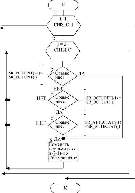 В этом модуле реализован один из методов упорядочения списка по убыванию значений элементов (в нашем случае по убыванию средних баллов по вступительным экзаменам и по аттестату). Идея метода состоит в том, что последовательно, начиная с первого элемента списка, сравниваются два рядом стоящих элемента. Если последующий элемент больше предыдущего, они меняются местами. Таким образом, если в списке n элементов, указанное сравнение выполняется (n-1) раз по количеству различных пар. Чтобы учесть соотношение не только рядом стоящих, но и разнесенных по списку элементов, описанный анализ пар элементов выполняется (n-1) раз. Иначе говоря, этот метод представляется вложенным циклическим алгоритмом (блоки 1 и 2). В блоке 3 сравниваются два рядом стоящих элемента в списке своими средними оценками за вступительные экзамены: если последующий элемент (абитуриент) имеет средний балл больше, чем предыдущий элемент, выполняется блок 6 и элементы меняются местами; иначе выполняется блок 4. В этом случае определяется, равны ли средние баллы за вступительные экзамены у рядом стоящих элементов в списке. Если это так (выход ДА из блока 4), в расчет берутся средние баллы за аттестат (блок 5): преимущества имеет тот абитуриент, у которого больше средний балл по аттестату при равных оценках на вступительных экзаменах. Если же окажется, что средний балл за вступительные экзамены у последующего элемента списка меньше, чем у предыдущего (выход НЕТ у блока 4), элементы местами не меняются – они и так упорядочены по убыванию среднего балла за вступительные экзамены. В блоке 5 анализируются средние баллы за аттестат. Этот анализ выполняется только тогда, когда средние оценки по вступительным экзаменам одинаковые у рядом стоящих в списке абитуриентов. Если средний балл по аттестату у последующего элемента больше, чем у предыдущего (выход ДА блока 5), элементы меняются в списке местами (блок 6). Иначе (выход НЕТ у блока 5) никаких преобразований в списке не происходит.