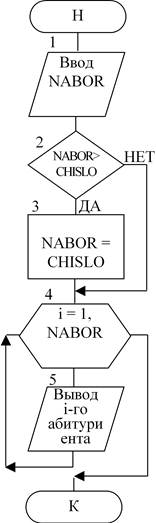 В блоке 1 вводится значение набора студентов. В блоке 2 определяется, превышает ли требуемый набор количество абитуриентов, допущенных к зачислению. Если вступительные экзамены успешно сдало меньшее количество абитуриентов, чем требуется (выход ДА из блока 2), то значение набора уменьшается до этой величины (блок 3). Иначе (выход НЕТ из блока 2) управление передается блоку 4, в котором организуется циклический алгоритм просмотра списка абитуриентов и вывод данных по каждому абитуриенту (блок 5). На этом работа алгоритма заканчивается: сформирован список абитуриентов, которые могут быть зачислены по результатам вступительных экзаменов.