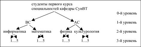 Решение задачи. Зададимся нулевым уровнем классификации – это все множество студентов первого курса кафедры СУиВТ (см. рисунок). Применим первый классификационный признак – пусть это шифр учебной группы. Получим первый уровень классификации.