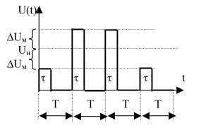 Пример 1. Выполнить амплитудно-импульсную модуляцию для дискретного сигнала 01102. Сигнал-носитель представлен на рисунке 1. Зададимся модификациями амплитуды базового сигнала-носителя: пусть уменьшение амплитуды импульса на величину ΔUм означает передачу двоичного 0, а увеличение на ту же величину – передачу двоичной 1. Тогда результат модуляции представлен на рисунке: