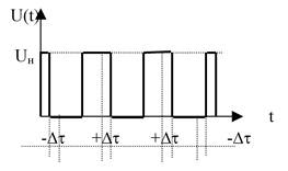 Пусть увеличение продолжительности импульса на время Δτ означает передачу двоичной 1, а уменьшение на ту же величину – передачу двоичного 0. Тогда результат модуляции представлен на рисунке: