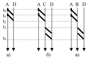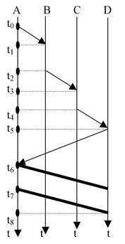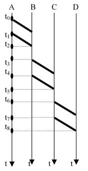В моменты времени t0 из пункта А одновременно начинается передача пакетов в направлениях D, С, В. В моменты времени t2 пакеты получены в указанных пунктах назначения (для простоты время передачи во все три пункта одинаково). Если в пунктах С и В последующие каналы заняты (на схеме они заняты одинаковое время), пакет ожидает освобождения канала (отрезок времени от t2 до t3). В течение времени (t4 – t3) пакет передается в пункт назначения, где из полученных пакетов собирается цельное сообщение.