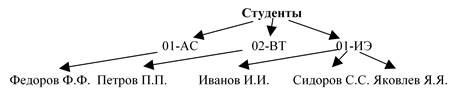 Данное дерево представляет состав студентов, например, некоторого факультета, с указанием учебных групп, в которых они числятся. Формально, в соответствии с данным выше определением, в этом дереве можно выделить следующие компоненты: