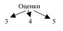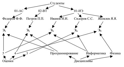 Очевидно, все три дерева в совокупности не позволяют показать, какой студент какую оценку по какому экзамену получил, что не обеспечивает корректности отображения информации. Выполним объединение деревьев, введя дополнительный уровень служебных элементов, показывающий недостающую связь. Получим сеть рисунка 12 (служебные элементы обозначены Эi, i = {1,2,3,4,5}, и показаны полужирно):