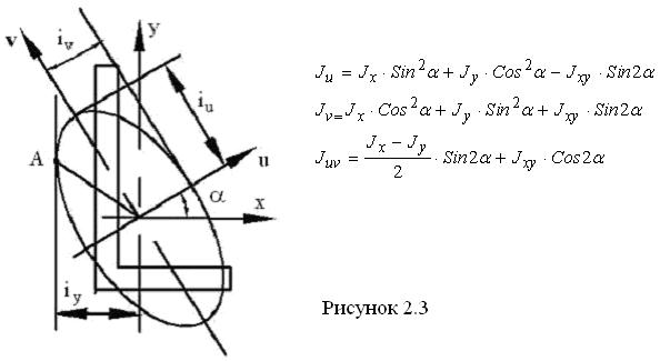 - максимальный и минимальный осевые моменты инерции сечения уголка относительно его главных осей