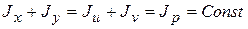 Сумма осевых моментов инерции сечения при повороте осей не меняется и определяется законом постоянства суммы осевых моментов инерции: сумма осевых моментов инерции относительно любых взаимно перпендикулярных центральных осей равна сумме главных моментов инерции относительно главных центральных осей и есть величина постоянная, равная полярному моменту инерции сечения относительно этих взаимно перпендикулярных осей.