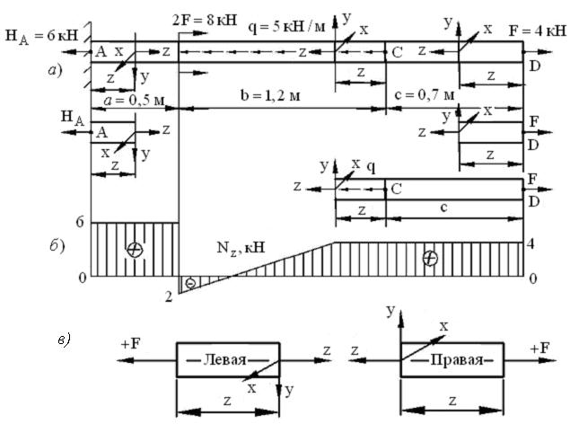 Пример 1 Построить эпюру продольной силы для стержня нагруженного внешними нагрузками q = 5 кН/м, F = 4 кН. Длина участков а = 0,5 м, b = 1,2 м,