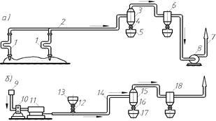 Рис. 5.3. Схемы пневмотранспортных установок: а)-всасывающего действия;