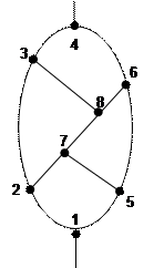 Сложные соединения. Сложными называются такие диагональные соединения, диагонали которых аэродинамически связаны между собой. Диагоналями будем называть внутренние ветви, связывающие между собой внешние (оконтуривающие) ветви соединения. Так, на рис. 13.4. внешними являются ветви 1 – 2 – 3 – 4 и 1 – 5 – 6 – 4, а диагоналями – 2 – 7 – 8 – 6, 2 – 7 – 5, 5 – 7 – 8 – 3, 3 – 8 – 6.