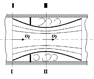 С аэродинамической точки зрения вентиляционное окно представляет собой диафрагму, которая вызывает резкое сужение воздушного потока (рис. 17.2). Сужение это продолжается за пределами окна до сечения II – II, затем поток расширяется. Таким образом, вентиляционное окноявляется местным аэродинамическим сопротивлением выработки. Когда воздушный поток проходит окно, происходит сжатие и расширение струи с возникновением обратных токов и завихрений.