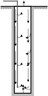 Таким образом, особенностью процесса вентиляции ствола является то, что кроме воздействия вентилятора, проветривающего ствол, на движение воздуха в стволе существенное влияние оказывают объемные (конвективные) силы и кинетическая энергия падающих капель воды. В результате их совокупного действия движение воздуха в стволе имеет следующий характер: у стенок ствола воздух движется вниз, а в средней части – вверх (рис.18.1). Восходящий поток воздуха является более мощным, чем нисходящий, и занимает основную часть поперечного сечения ствола. Последнее объясняется тем, что вверх движется не только количество воздуха, которое опустилось в ствол вдоль стенок, но и количество воздуха, нагнетаемое вентилятором.