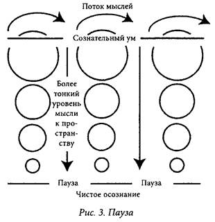 Пустое пространство, пауза между мыслями, наблюдаемая вами, было переживанием не-опыта, о котором я говорил выше. Этот не-опыт и был чистым осознанием (рис. 3 «Пауза»).