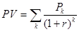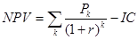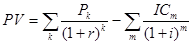 Допустим, делается прогноз, что инвестиция (IС) будет генерировать в течение п лет годовые доходы в размере Р1, Р2,..., Рп. Общая накопленная величина дисконтированных доходов и чистый приведенный эффект соответственно рассчитываются по формулам:
