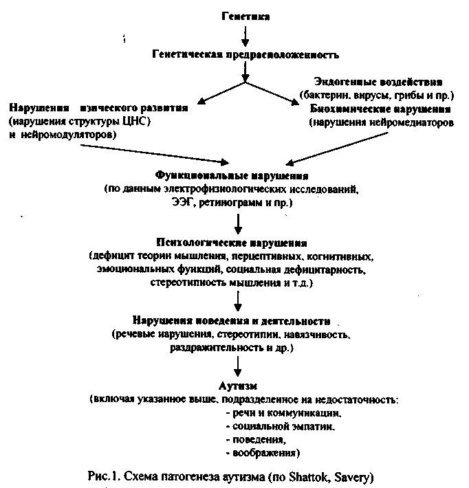 Однако предпринимаются попытки разработать интегральную этиопатогенетическую модель развития аутизма (см. рис. 1). Возможно, реализацией наследственной предрасположенности через различные внешние факторы можно объяснить и многообразие аутистических синдромов.