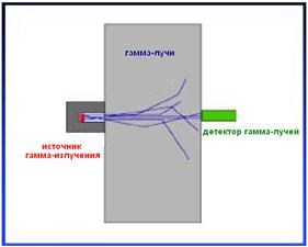 Дальний детектор регистрирует интенсивность гамма-излучения, дошедшего до него. Чем больше плотность породы, тем меньше интенсивность.
