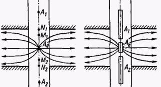 В 7-ми электродном зонде электроды смонтированы на гибком кабеле или на изолированной трубе. Зонд имеет три однополярных токовых электрода (Ао, А1и А2) и две пары измерительных электродов (M1N1 , M2N2). Через центральный электрод Ао и через фокусирующие электроды А1 и А2 пропускают ток одной полярности. Сила тока, протекающего через фокусирующие электроды, регулируется так, чтобы независимо от сопротивления горных пород и сопротивления бурового раствора обеспечить равенство потенциалов электродов Ао, А1и А2 при неизменном токе 10, текущем через центральный электрод. Условие сохранения равенства потенциалов между токовыми электродами, будет выполняться, если разность потенциалов между двумя парами измерительных электродов M2N2поддерживать равной нулю путем изменения силы экранного тока. Поскольку при этом потенциалы электродов Ао, А1и А2 окажутся равны, ток не сможет течь вдоль скважины и направится фокусированным пучком в горную породу.