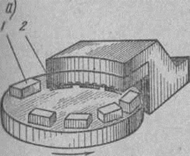 Нa станках непрерывного действия с карусельным столом (рис. 10, а) или с барабаном (рис. 10, б), по окружности которых детали 1 располагаются в приспособлениях, стол или барабан при вращении перемещает детали мимо протяжек 2, которые обрабатывают поверхности деталей.